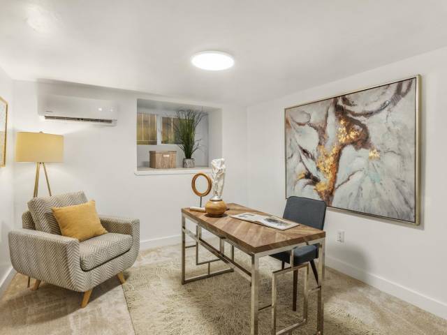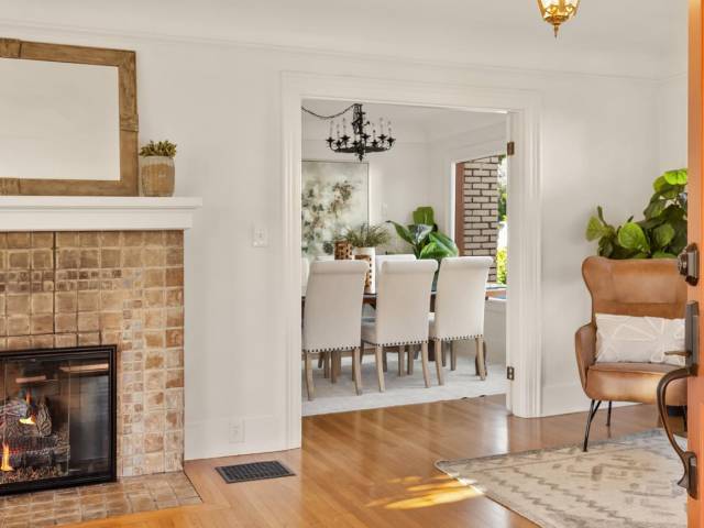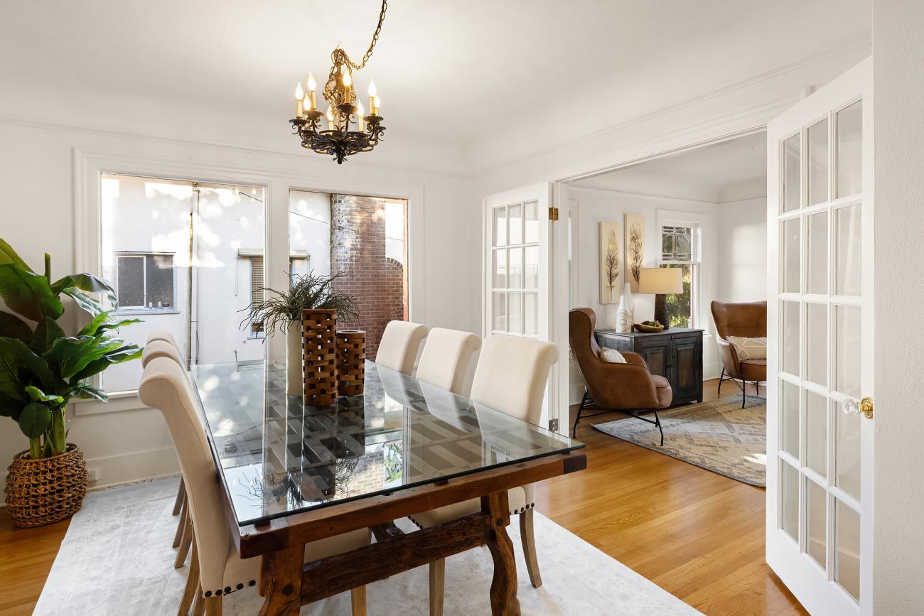 Elegant Main Level: Coved ceilings, French doors, formal dining room, 2 bedrooms, and an updated bath